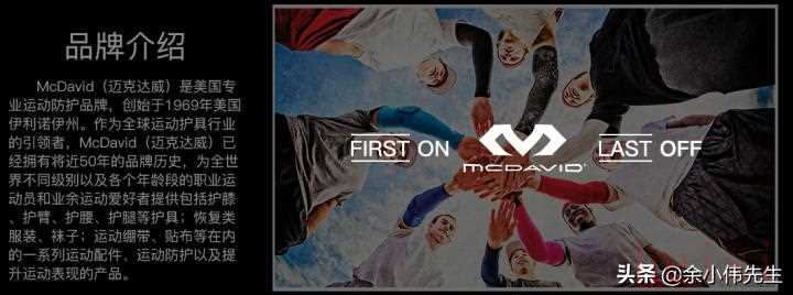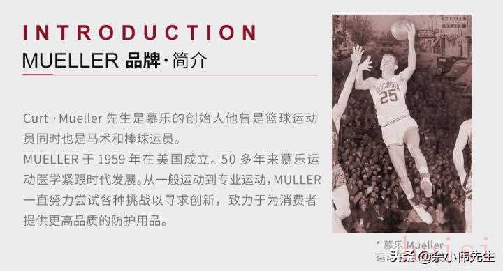 6、Mueller(慕乐):Mueller家族始于瑞士,后移民至美国的威斯康辛州。Mueller运动医疗公司从一间小型的药局开始创业,创办者O.P. Mueller家族均为药剂师,本身也是一名篮球员,因热爱运动且深受运动伤害之扰,1960年首先创立并传达运动医疗(Sports Medicine)和运动伤害防护员(Athletic Trainer)的概念,结合各方医学专材研发各类型运动护具,启动运动防护领域革命性挑战。成立于1959年的Mueller首先创立并传达“运动医疗”和“运动伤害防护员”的概念,并结合医学研发各类型运动护具,一直领导运动防护领域的革新。60年代,Mueller开始在全球销售运动医疗产品。80年代,Mueller首创“运动医疗(R)零售”概念,将专业运动医疗室提供的防护产品通过零售渠道带给一般消费者。从一般运动到专业运动范畴,Mueller一直在努力尝试各种挑战以寻求创新,Mueller致力于成为运动医学领域的先驱者。慕乐基于对运动人士需求的深刻理解,在研发、营销运动护理产品的过程中形成了一整套技术标准,由此确立并巩固了在运动护理用品行业的领导地位。