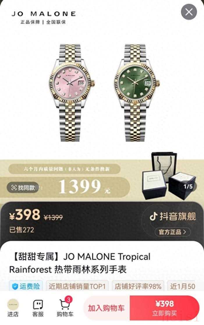 在各大线上平台上,一家名为JO MALONE的店铺进入消费者视野。该商家的一款商品与动辄售价十万元的劳力士日志型手表外观近似,但在JO MALONE店铺直播中,仅售398元。
