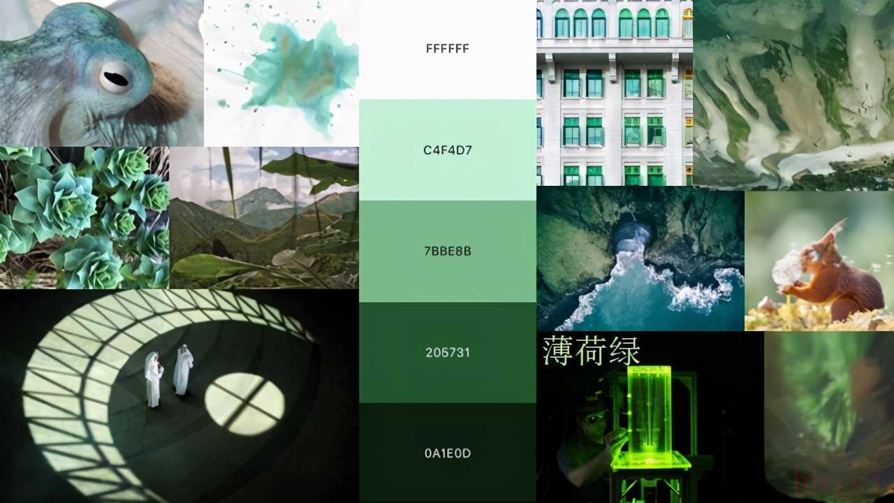 系列充满自然能量的活力色调,每种绿色代表不同的生命以及状态。比方说嫩绿色代表新的生命和弱小的生命状态,青翠色代表勃勃生机的状态,深绿色代表成熟而具有沧桑感的生命状态,展现出生命价值、创造世间美好生生不息的源泉。