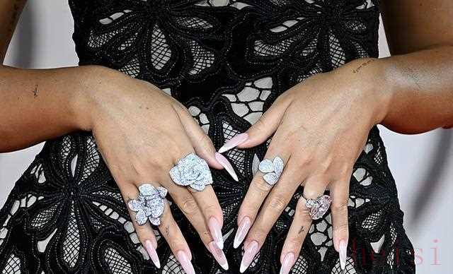 "“满手钻石”:" 这个说法可能有些夸张。通常情况下,即使佩戴多枚戒指,也不会达到“满手”的程度。这可能是指她佩戴了多枚带有大颗钻石或宝石的戒指,或者是指她的手上有非常显眼的、价值极高的戒指组合,给人造成了“满手”的印象。
