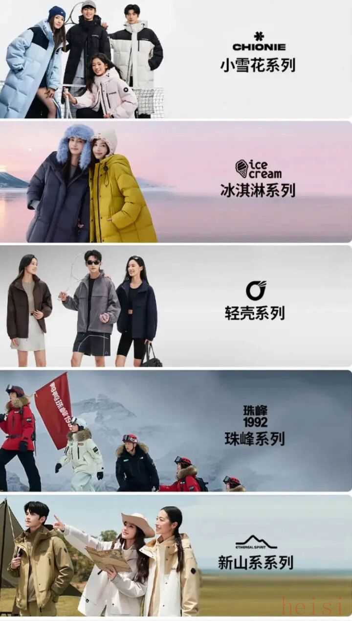 其产品结构中,基础款占了最大比重,其余为个性化设计款、IP/设计师联名款、高奢鹅绒系列及主题定制款。品类覆盖马甲、轻薄/中厚/厚款羽绒服,精准满足不同性别、年龄及温度带需求。