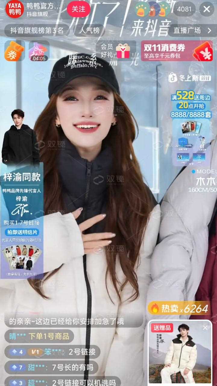 刚刚结束的抖音电商双11,鸭鸭爆品羽绒服单款销量超过25万件,直播间峰值在线人数突破2万。