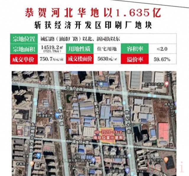 其中03-2号地块(经济开发区印刷厂地块)参与竞拍的有中梁、河南嘉州、大美、河北华地、河北缔昌、邯郸鸿德、衡水天正、邯郸世茂、邯郸帛圆、碧桂园、和义大道、保利、荣盛。经过多轮激烈的角逐,最终被河北华地地产以1.635亿元竞得,溢价率59.67%,成交单价750.7万元/亩,楼面价5630元/㎡(刷新邯郸楼面价最高纪录),这也是河北华地(沧州·百丰地产)首进邯郸房地产市场。