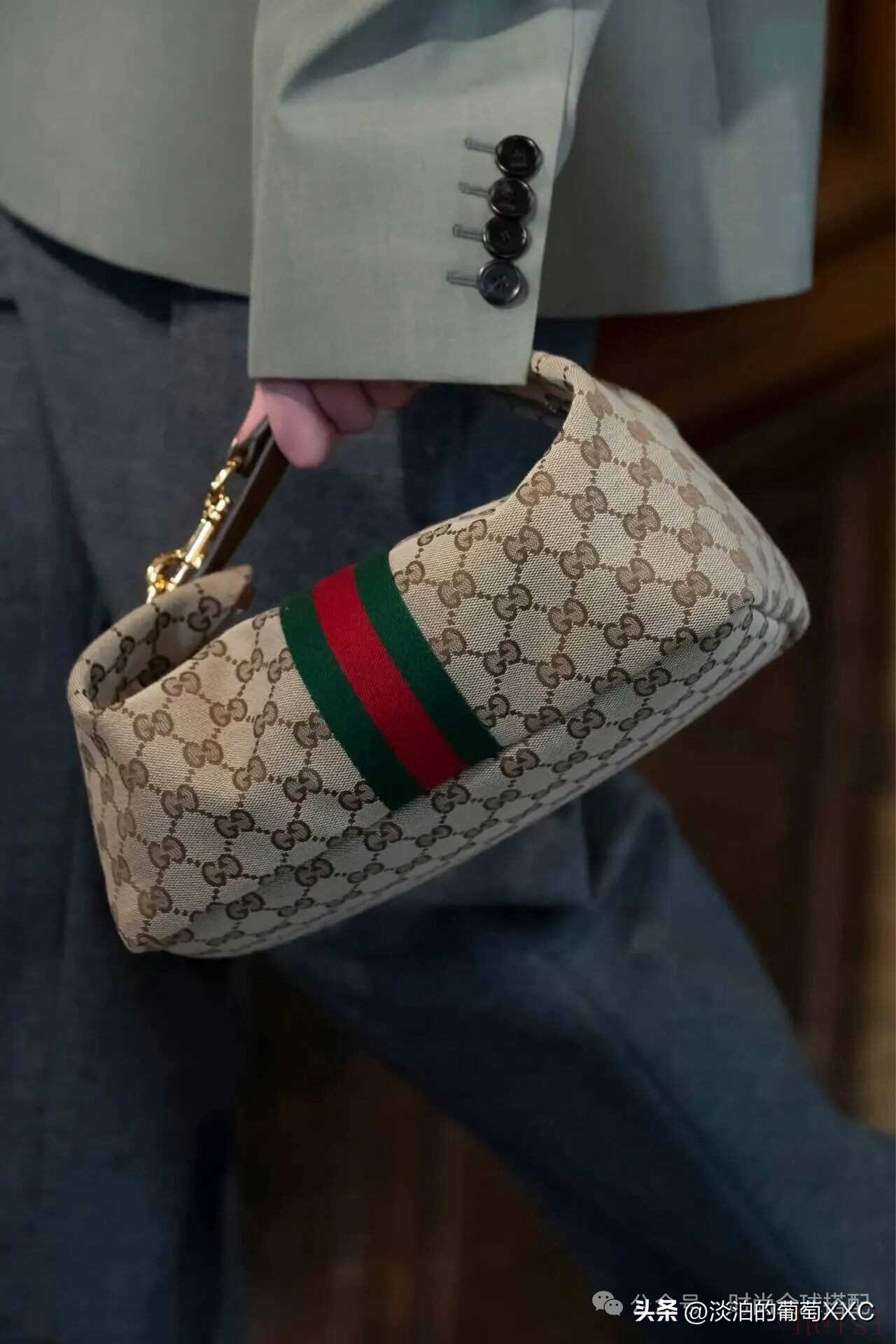 经典老花配红绿条纹,自带复古滤镜,搭浅绿西装的细节感(袖口排扣),低调里藏着贵气。
