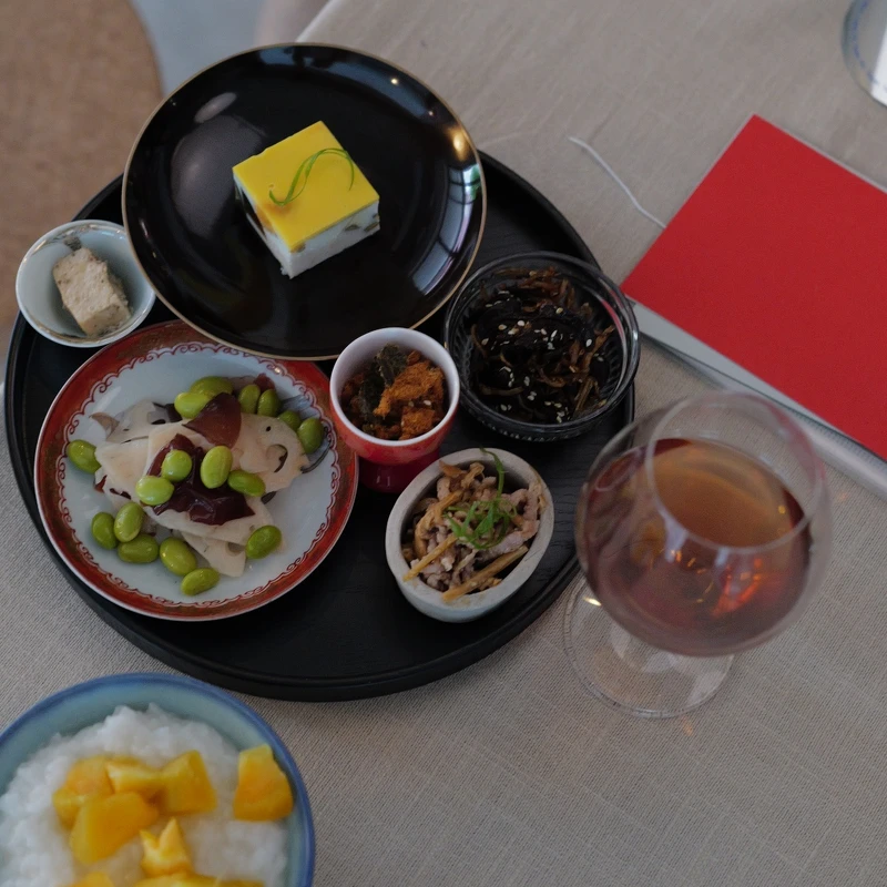 酒单和菜单一样简单直白。除了简单的一加一调酒,其余几乎清一色是自然酒。除了个人偏好,也是一种对这个世代的回应:加上他认为,自然酒与中式、亚洲料理其实是很合理,却在台湾仍不算常见的组合。 在这里,与找到了最大公约数。例如看似平凡的滷味里加入了昂贵的梅露,从 LOUU 产品延伸而来的新品,被转化为酒家菜,用实际的行动让客人透过品嚐、範例,理解什么叫做在家。