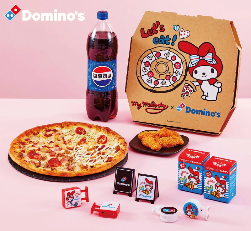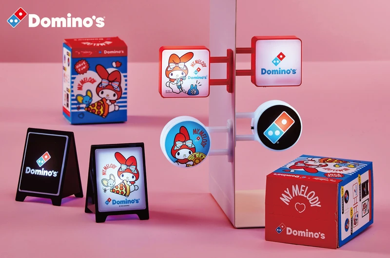 披萨盒上的美乐蒂特别繫上象徵达美乐品牌色调的红、蓝双色蝴蝶结,并巧妙融入起司火山披萨等经典元素,被粉丝封为。即日起只要订购任一大披萨或任一联名套餐,即可免费获得此限定联名披萨盒。