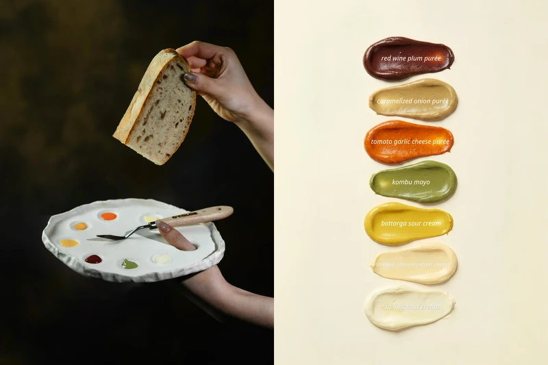 小编力推酸种麵包与7种抹酱的情绪色谱!Moon Baking Studio最擅长以麵包承载感受,夜间登场的以自家招牌酸种麵包,搭配7款手作抹酱,像是一张可以被观看、嗅闻与品嚐的情绪画布。微酸如红酒李子的沉静风味,焦糖洋葱带来熟悉而温柔的记忆,燻鲑鱼的烟燻香气层层堆叠,白酒酸奶则留下清爽而俐落的尾韵。其中也藏着主厨私藏的混搭组合,不同抹酱之间的风味变化让人愿意多花一点时间探索,每一种风味都抓住了小编的味蕾。