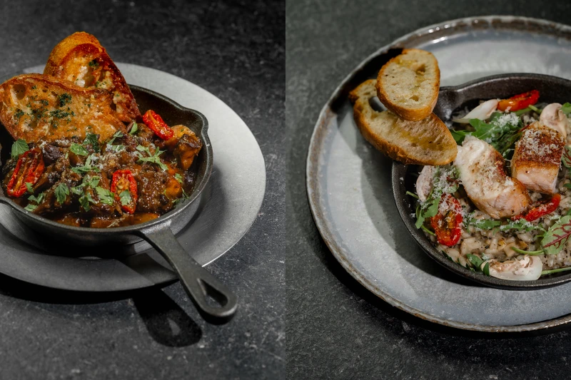 夜晚的主菜设计延续品牌精神BAKE、ART、LIFE,选择适合慢慢享用的料理节奏。红酒炖牛尾香气浓厚适合冬夜分享,松露石斑炖饭层次细緻、口感温润,油封鸭腿与焦香番茄小卷则在鹹香与酸甜之间取得平衡。这份夜间菜单像一张为黑夜描绘的星图,每一道菜都需要时间慢慢品嚐和享受~