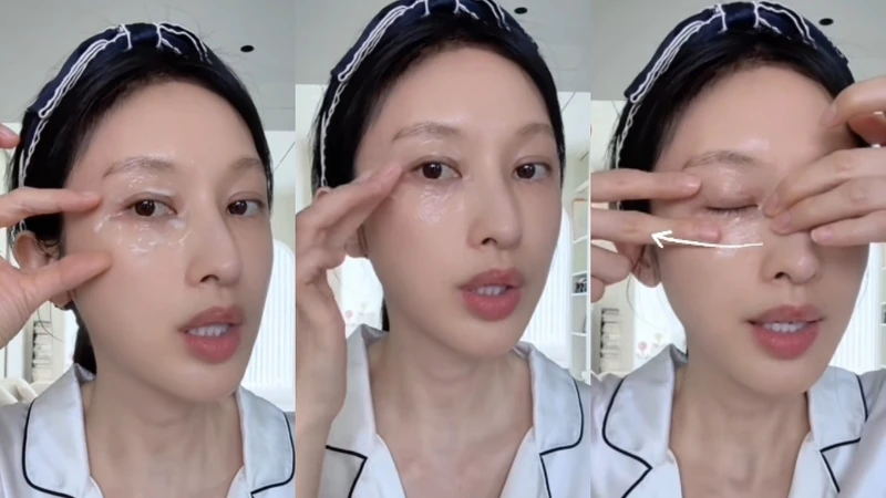 张俪分享,因工作经常熬夜拍戏、隔天又得早起赶通告,她会在睡前取黄豆大小用量的眼霜,重点涂抹于上眼皮与内外眼角,并搭配简单按摩,帮助眼周放鬆。
