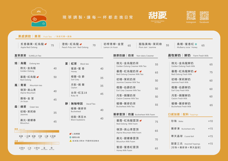 甜夏SUMELLA诞生于台南,品牌不走传统大量预煮的手摇饮路线,而是以为核心,每杯茶皆于点单后现场萃取,保留茶叶最原始、乾净的香气与层次,这样的坚持让甜夏成为不少台南人反覆回访的私藏名单。此次北上展店,把空间铺上低彩度的暖橙色,搭配奶雾白的圆弧流线与线条色块,期望在繁忙的信义商圈中,打造出一处质感内敛的慢饮据点。