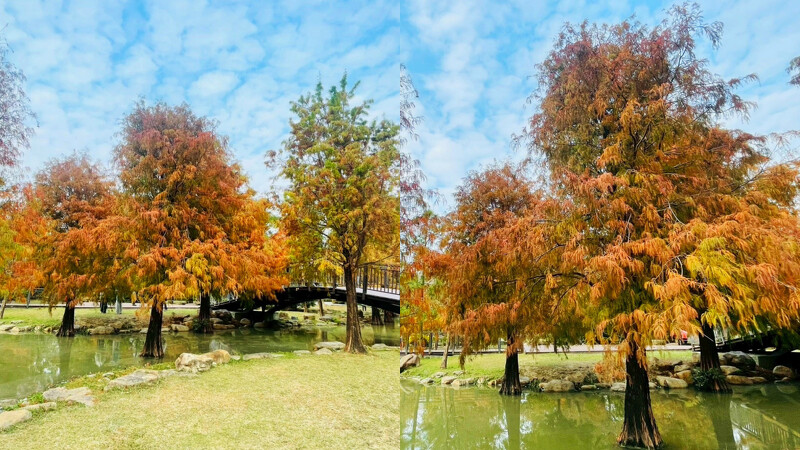 佔地10公顷的凹子底森林公园,其园内的落羽松生长已超过15年,现在沿着生态池畔漫步,会发现落羽松正随着季节换上暖色系外衣!在冬日阳光映照下,绿、黄、橘红多重色调交织、倒映水面上。1月中至2月初是最美季节,颜色还会转成焦糖橘红色,3点后前来拍照,能捕捉到柔和风景画面,不必远行便能享受如置身国外的静谧时光。