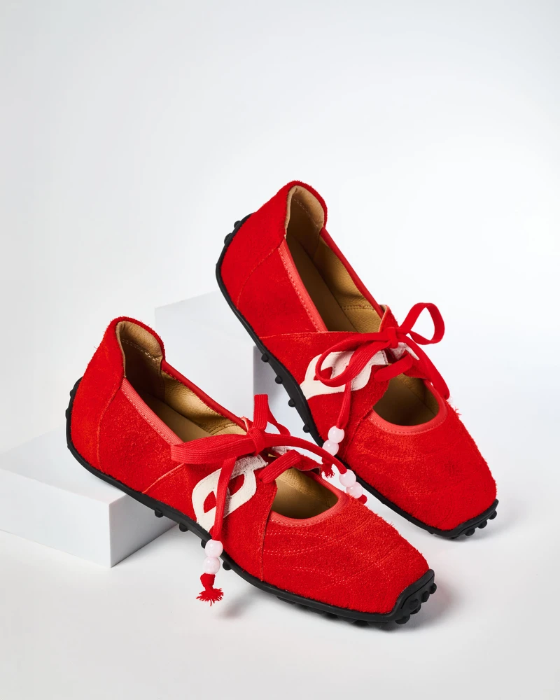 春节新年的时尚搭配里总是要有红色单品才喜气吧!众韩国女星都在穿的芭蕾舞鞋换上大胆的亮红色系,以麂皮材质增添不一样的高级质感,白色LOGO与蝴蝶结绑带设计更增添鞋款的活力氛围,肯定能让你成为人群中的可爱焦点!