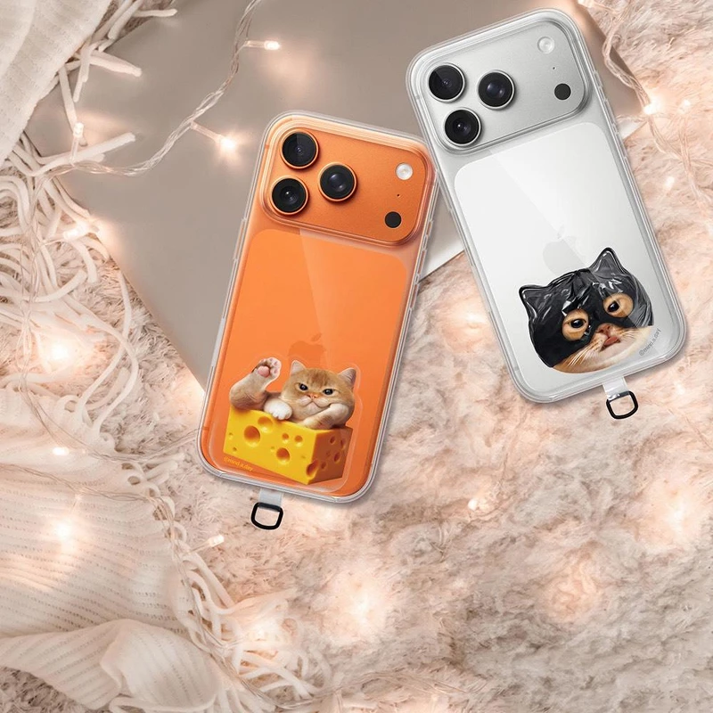 一款为橘猫躺在起司里,另一款则是戴着黑色蒙面的猫,放在透明手机壳后面既吸睛又有趣。