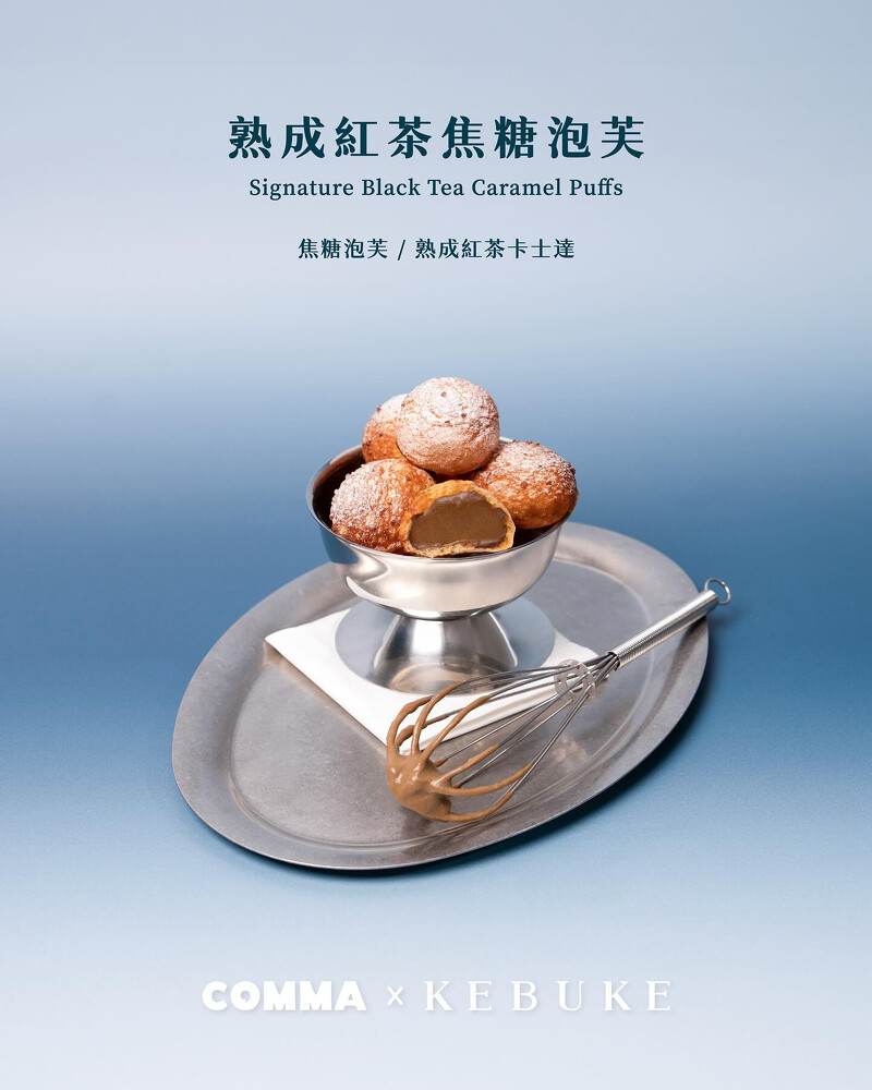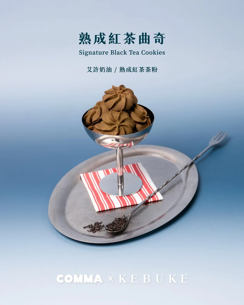 此次联名将可不可招牌的灵魂注入COMMA经典的法式焦糖泡芙、费南雪与曲奇中。将茶叶研磨至细緻后,融入COMMA招牌的艾许奶油麵糊中,奶油的优雅乳香与熟成红茶特有的醇厚果香、桂圆香气交织,打造出兼具香气、口感与记忆点的全新系列。