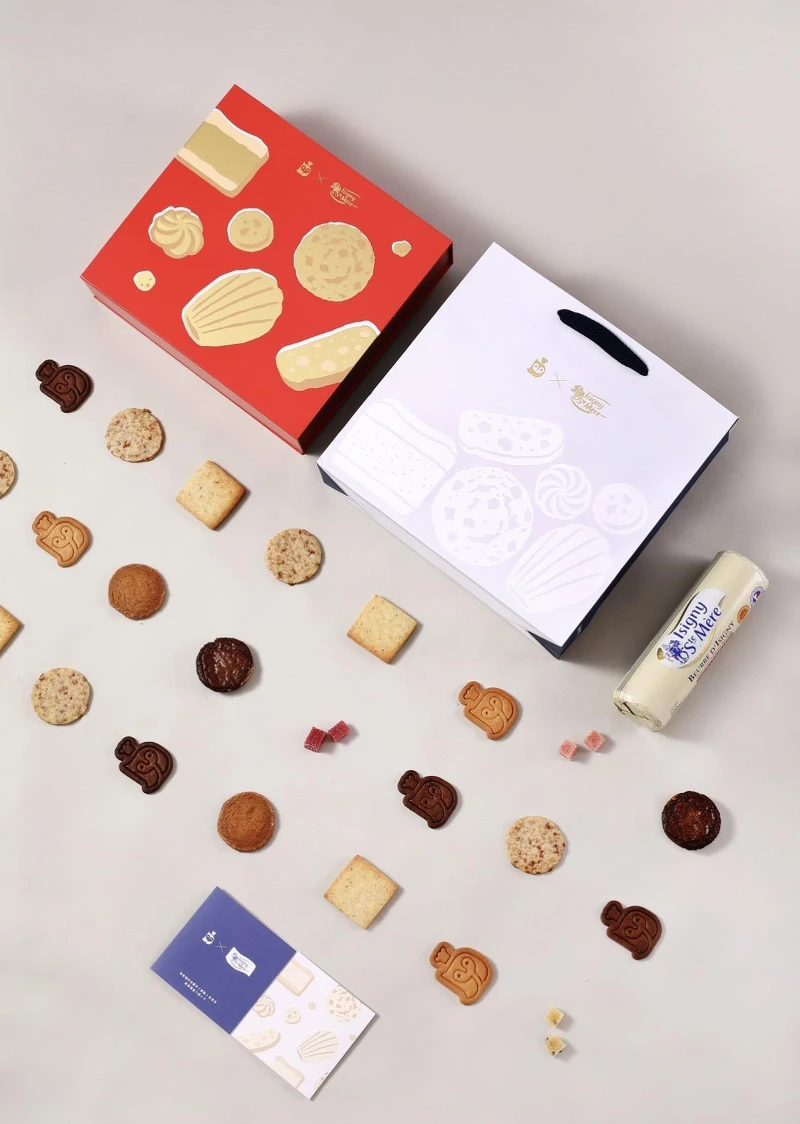 农曆年前登场的成为这段合作的第一份实体答卷,礼盒集结五款手工饼乾与法式水果软糖,包含香料焦糖钻石饼乾、巧克力布列塔尼酥饼、塔皮饼乾、依思尼焦糖沙布列,以及米莫雷起司胡椒饼乾。其中沙布列以低温烘烤保留最纯粹的奶油轮廓,焦糖酱、焦糖粒与海盐粒交织出细緻而耐吃的脆感。起司胡椒饼乾则大方使用陈年米莫雷乳酪,搭配贡布胡椒的辛香,鹹甜转折俐落。红底烫金礼盒配上白色提袋与蓝色提把,低调呼应台法元素,也让这份礼盒多了一层象徵交流的意义。