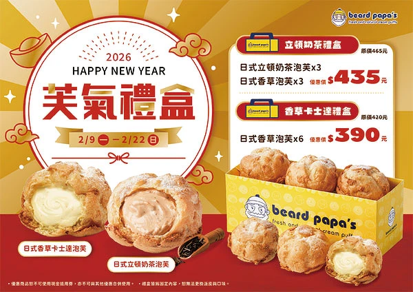 针对年节送礼与家庭分享需求,beard papa‘s将于2月9日至2月22日期间,推出 ,可以一次享受到日式香草泡芙与立顿奶茶泡芙。此外为了回馈粉丝,品牌更推出的超有感加码。凡于门市购买两颗立顿奶茶系列泡芙,即可免费获得沖泡包乙包,在家就能轻鬆自製奢华的泡芙加奶茶下午茶。